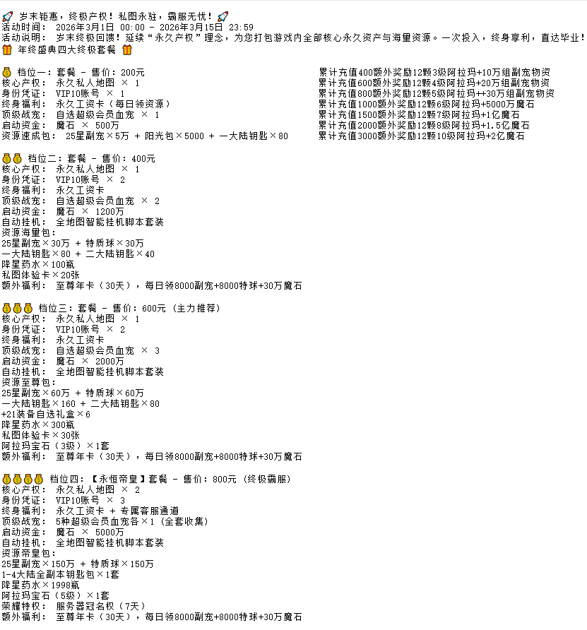 岁末终极回馈!提供200元至800元多档终极套餐,打包全部核心永久资产与海量资源。